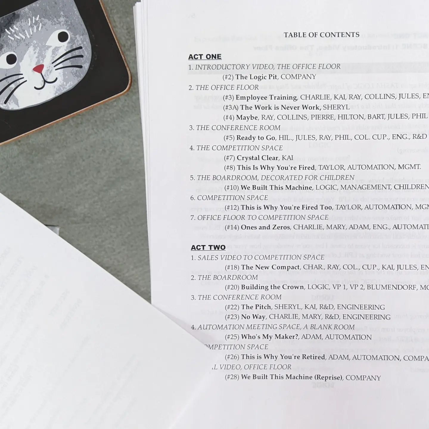 An early table of contents. In the first drafts, the song “The New Compact” was sung by Engineering rather than by R&D.